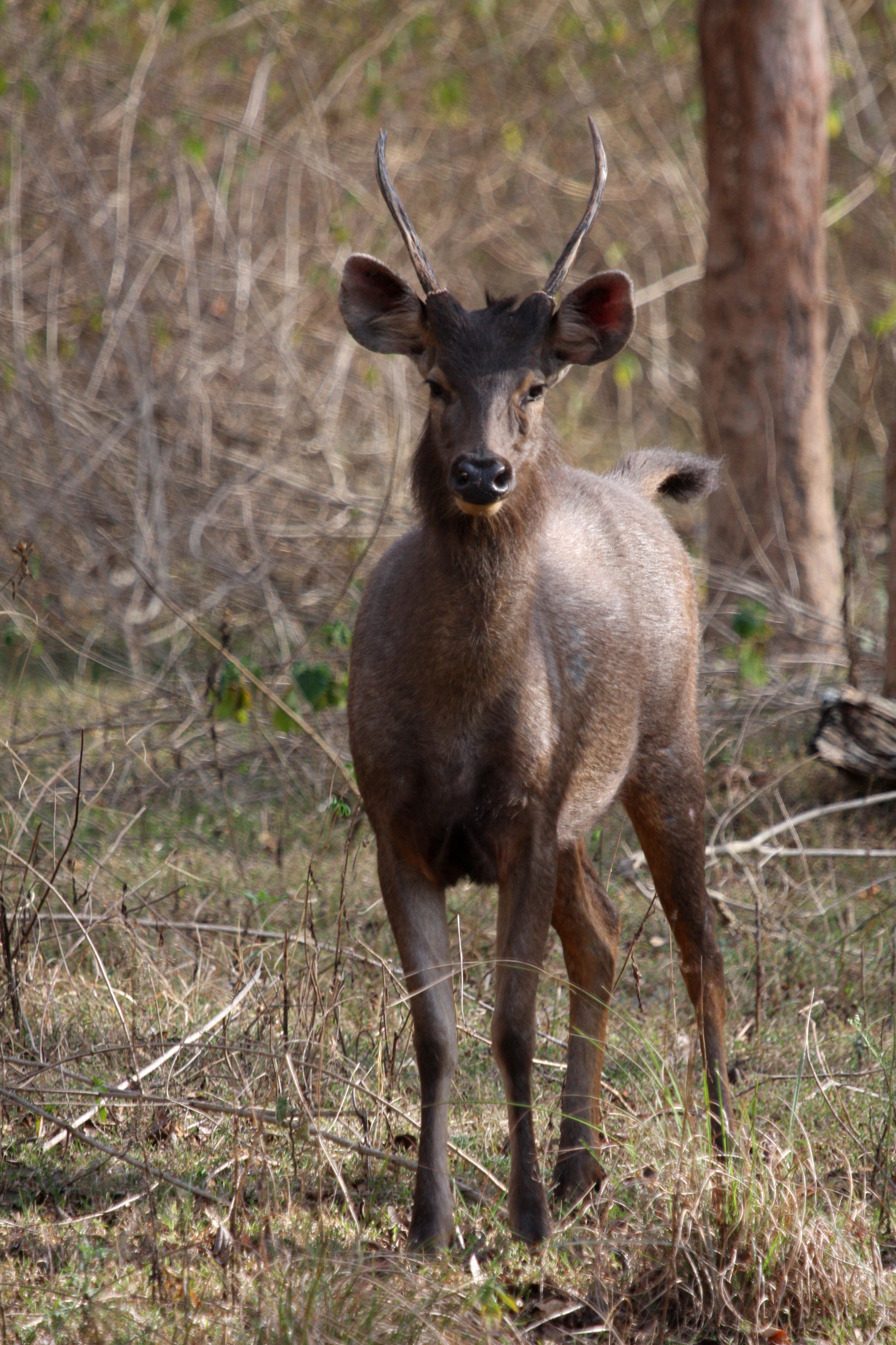 Two encounters with atypical individuals happened in the first safari. The first one concerned a sambar stag. We sighted it beside the track and halted. The stag was frozen immobile and alert, watching us. We inched forward in spurts getting closer and closer, and it didn’t move a muscle. Finally when we were practically beside it, its nerve gave way and stamping its foreleg as sambar are wont to do when spooked, it honked in alarm, the sudden loud calls resonating in the quiet of the jungle. Another unseen individual in lantana thickets just beyond was unnerved by these calls and gave alarm too. The herd of three finally disappeared, crashing through the undergrowth.