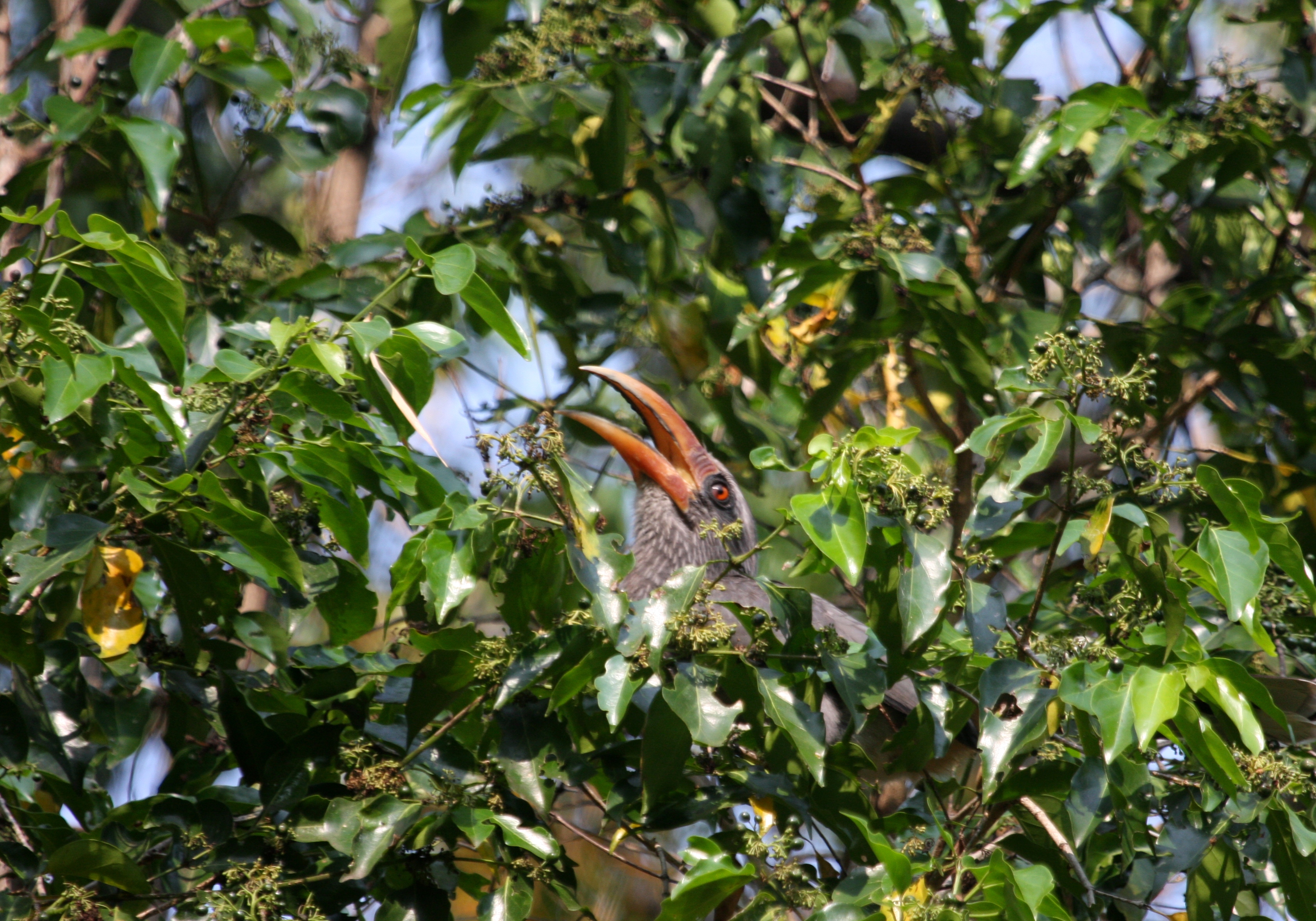 We expected sunrise and sunset hours to be especially spectacular around the FRH, and they were. We woke up to the calls of Malabar whistling thrushes, Asian fairy bluebirds (plenty of them around), Hill mynas, Malabar grey hornbills and Grey jungle fowl. On a single tree in the camp, we counted four species of bulbul all at once – Red whiskered, Flame throated, White-browed and Yellow-browed. There were quite a few Black bulbuls around, but they regrettably did not join in the record attempt or else we’d have seen five species of bulbul all on one tree. And this was in addition to a Malabar giant squirrel, a Malabar grey hornbill and a couple of Green barbets that were foraging on the same tree. Elsewhere around the camp we saw Hill myna, Racket-tailed drongo (plenty of both), Malabar whistling thrush, Asian fairy bluebird (dozens of them), Golden oriole, Puff throated babbler, Brown-cheeked fulvetta, Orange minivet, Cinereous tit, Nilgiri flycatcher, Crimson-backed sunbird (plenty of these too), Pond heron, Common kingfisher (both by the stream), Lesser flameback and Nilgiri langur (there were plenty of Bonnet macaque in the camp).