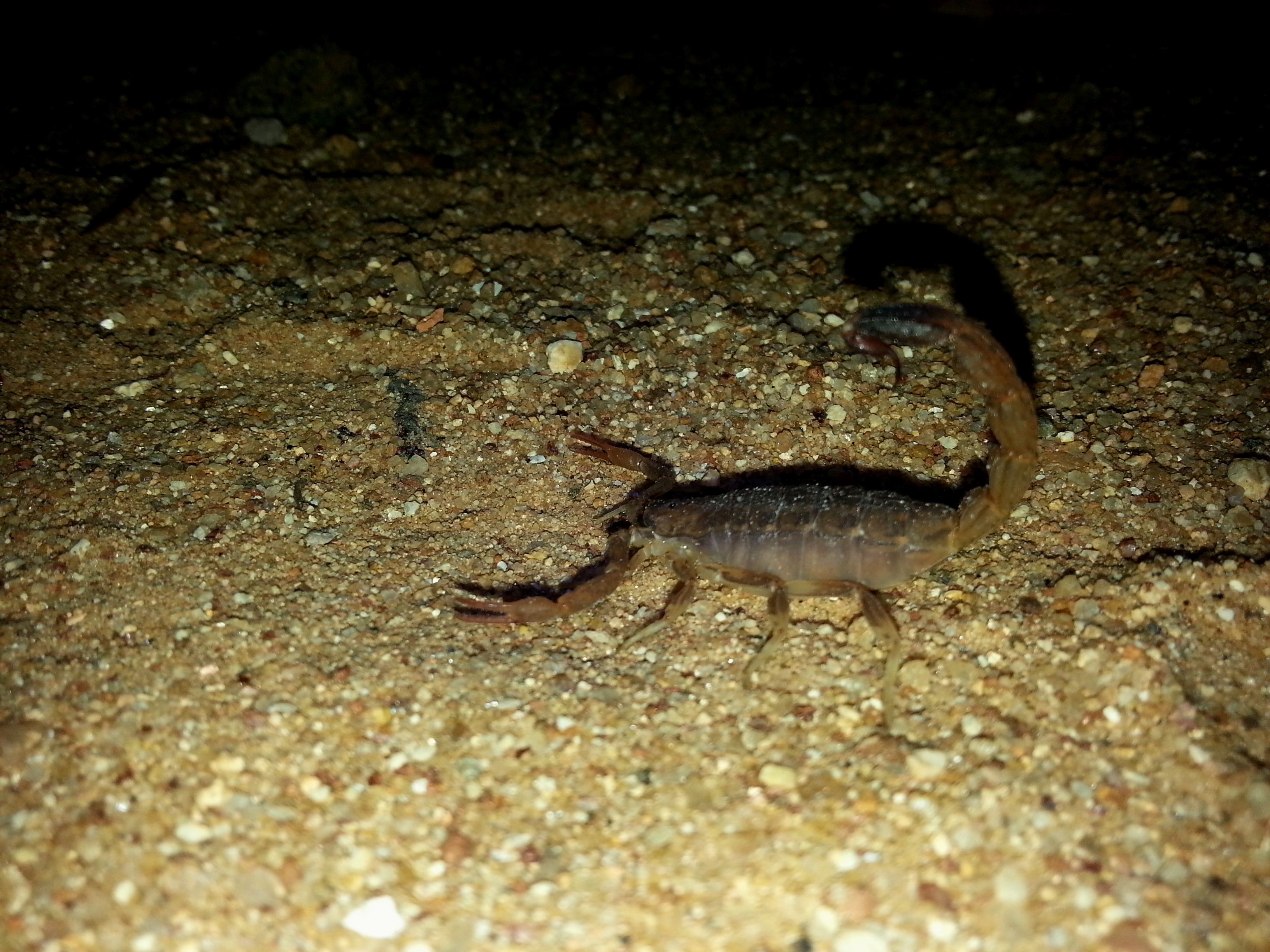 Standing outside the dorm at about 4:30 in the evening, we saw a couple of dhole canter across the road. Grabbing my camera, GK and I hurried after them, but they’d moved on and we got no pictures. There was some birdlife around, but I couldn’t do much without my bins. All we saw was Sambar, bonnet macaques, tufted langurs, Indian giant squirrel, Indian treepie, peafowl, Small minivet, coucal, Magpie robin, White-cheeked barbet, Grey junglefowl and Blue-faced malkoha. And we heard hoopoe, Savanna nightjar and what evidently was the Mottled wood owl calling (the latter two after sundown, naturally). A Changeable hawk eagle called persistently all day; we eventually located it and sighted it a few times. A couple of species of scorpion were met with around the dorm.
